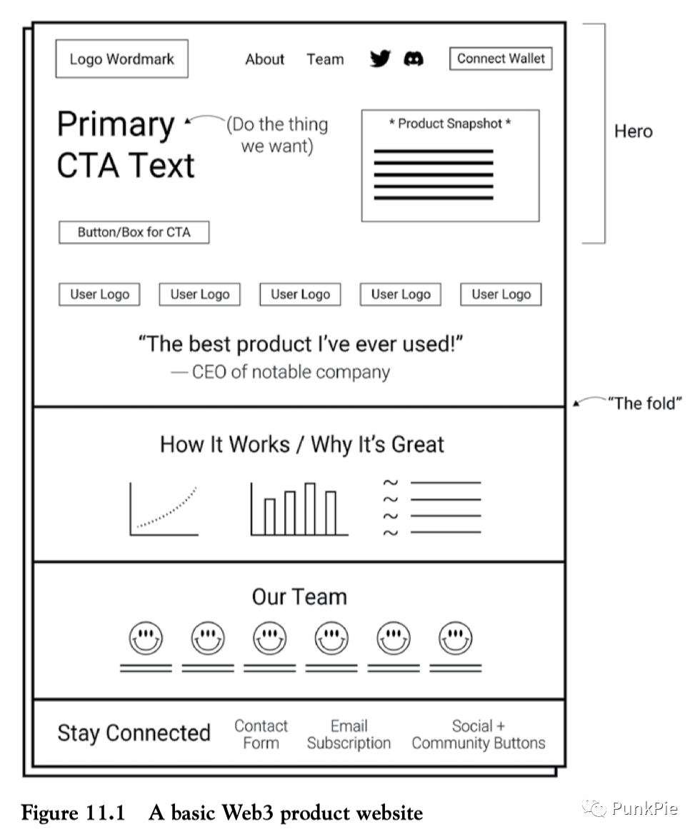 图 11.1 模拟了 Web3 产品网站的基本布局,指示了关键设计和营销元素的位置。